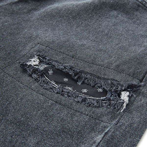 The embellishment of the ripped floral print patch and the design of dark gray washed denim make the design simple and not monotonous.