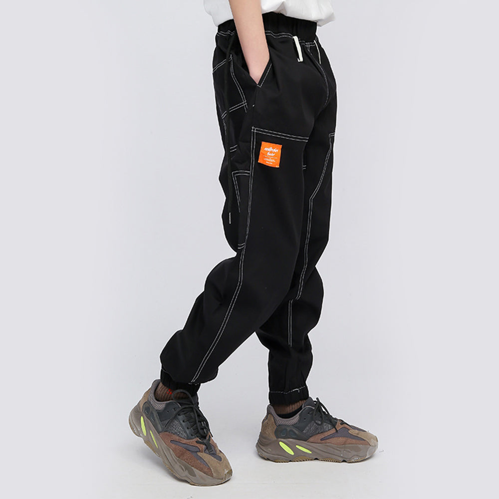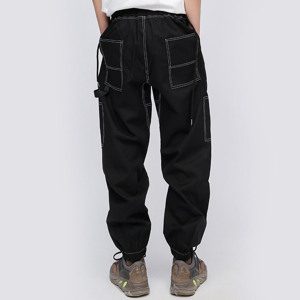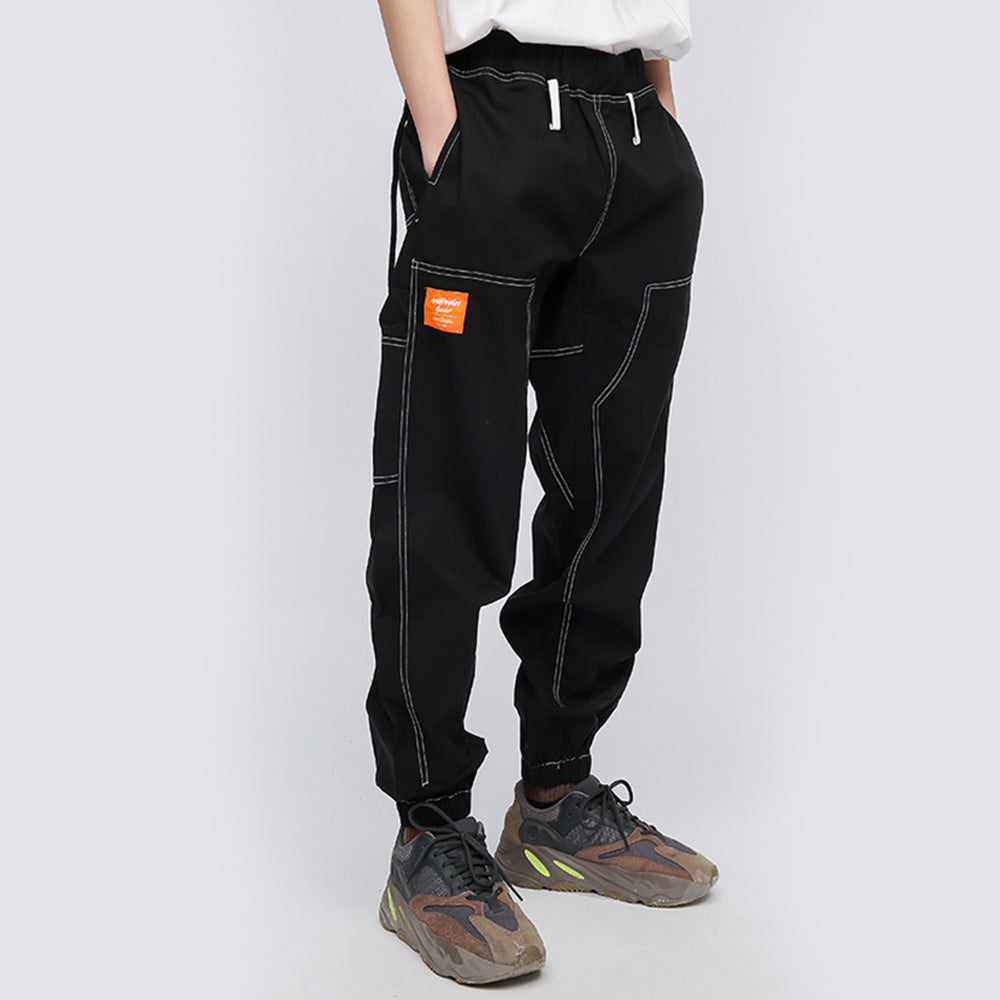 The legs feature down to the tapered ankles and are concluded with ribbed ankle bands. This unique comic suture embellishment street style also comes with an elasticated waistband and drawcord.