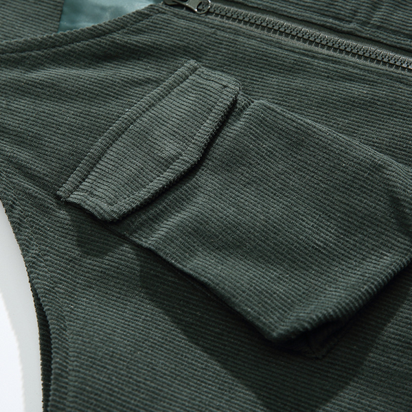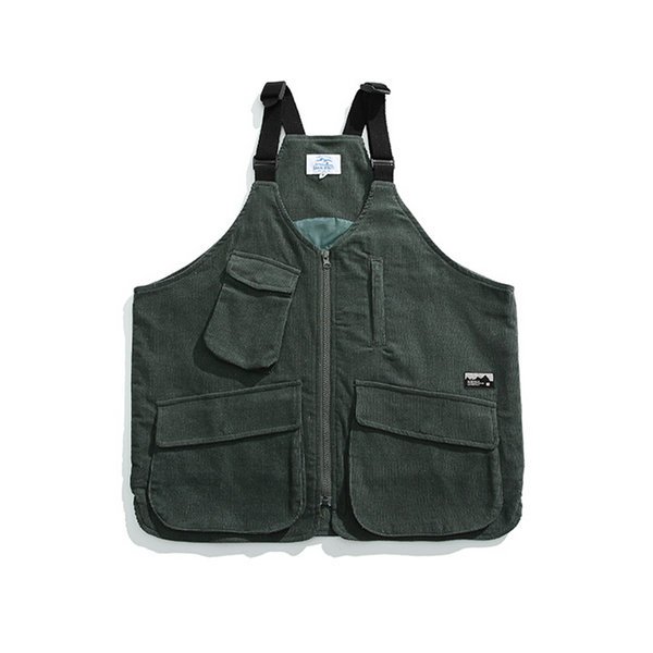 This Army Green Functional Vest is made of 95% cotton and features adjustable straps and a zip-up closure. The vest also boasts three-dimensional decorative patch pockets on the chest for a Japanese retro work aesthetic.